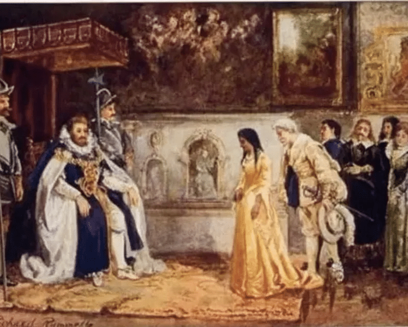 Pocahontas’s arrival in English society caused an immediate stir. When she was presented at the royal court, she was received with fascination and respect—treated like a princess due to her lineage as the daughter of a powerful chief. Her warm, caramel-toned skin, striking dark hair, and quiet elegance captivated the English elite.